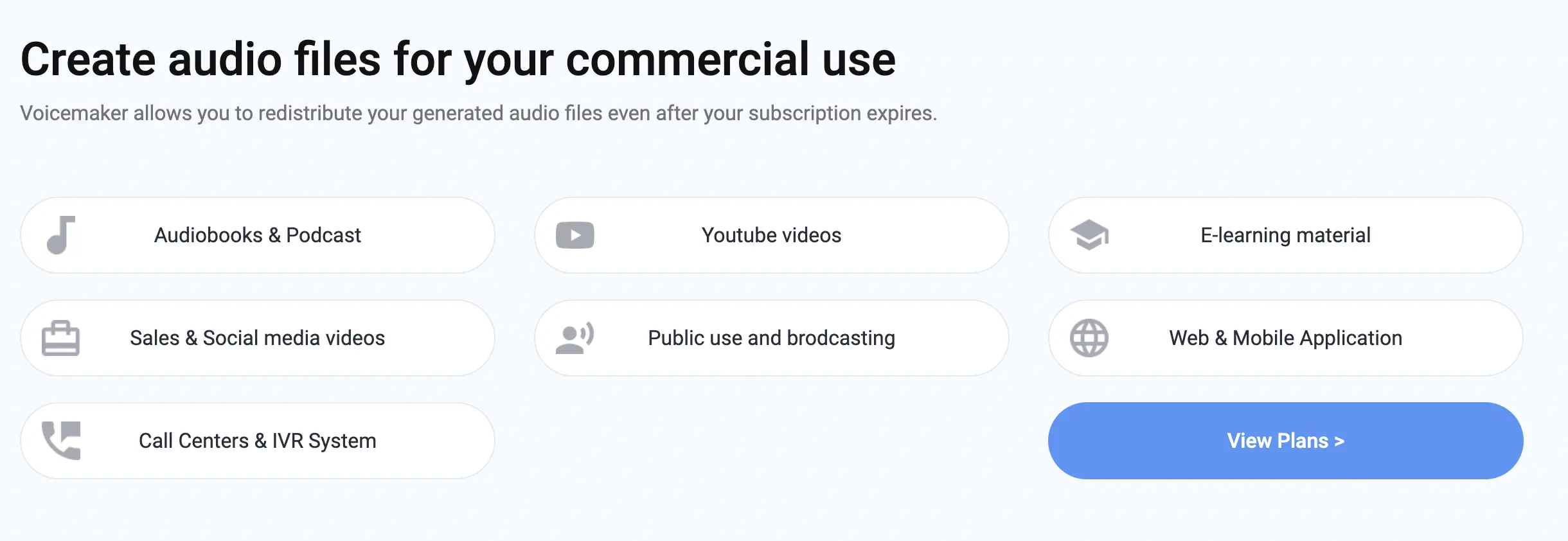 Voicemaker est très clair : le plan gratuit est pour le test. Pour gagner de l’argent avec vos audios, le plan Starter est le minimum syndical. Notez que la diffusion TV et Radio nationale nécessite souvent une licence étendue (Add-on).