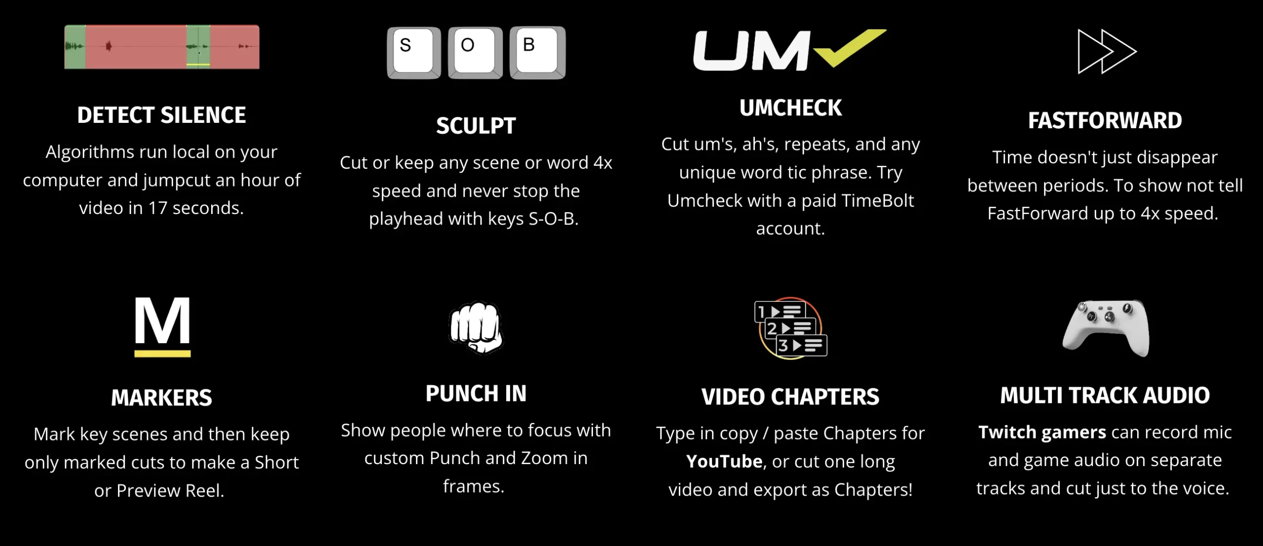 Si vous filmez en face caméra avec beaucoup de parole (vlogs, tutos, commentaires), Timebolt est un game-changer absolu. Il supprime automatiquement tous vos « euh », silences et respirations.