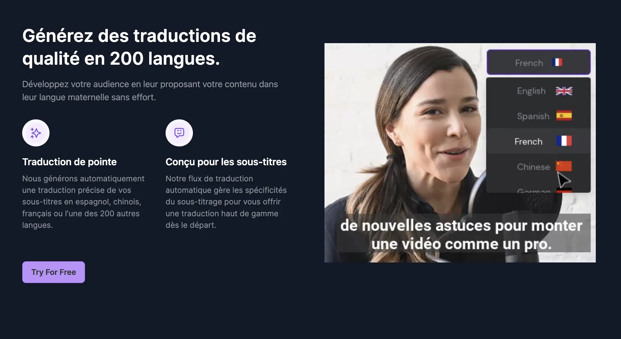 Indispensable pour les YouTubers ou formateurs visant une audience mondiale (E-learning multilingue).